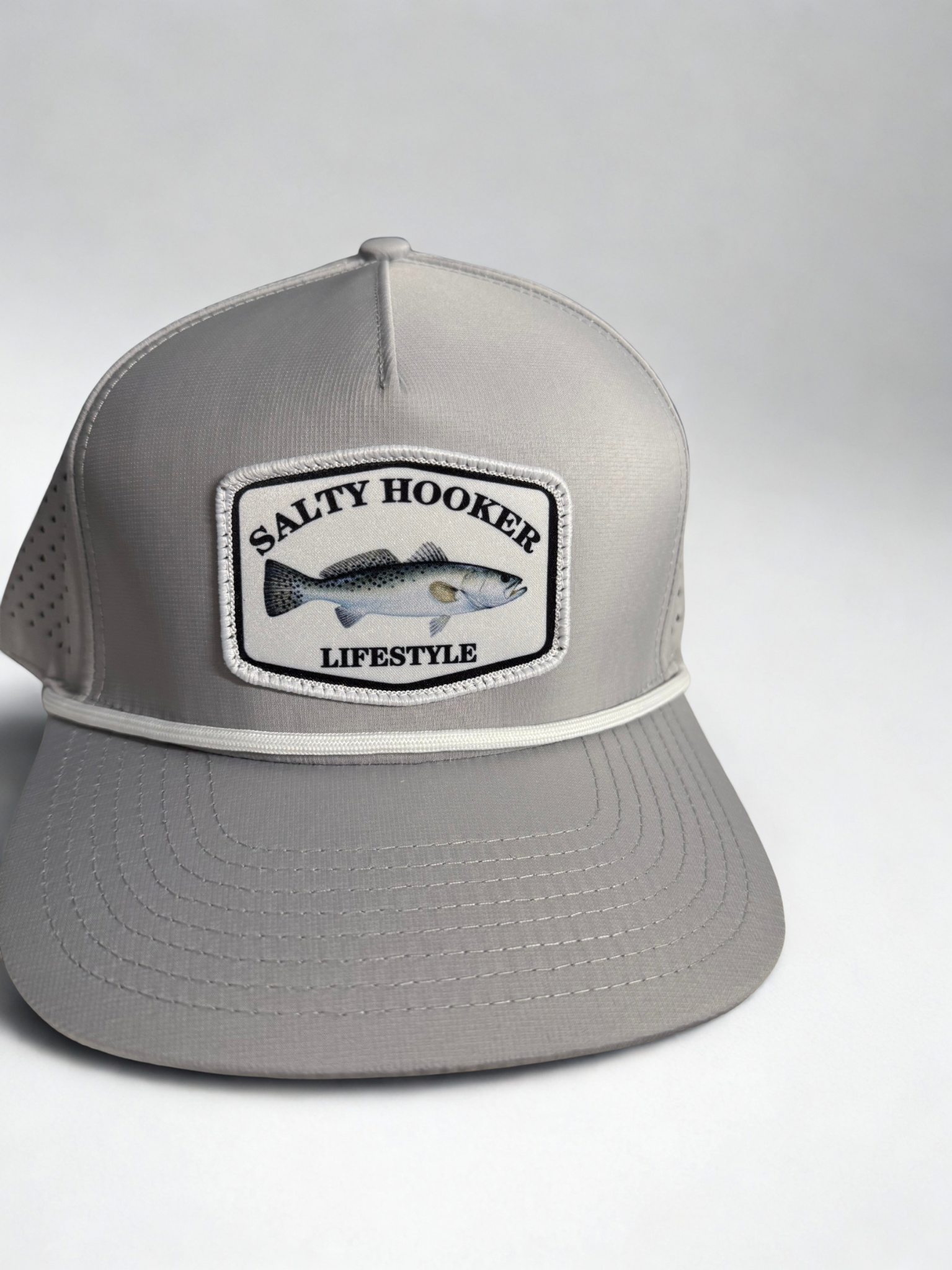 Show off your love for the water with the Salty Hooker Lifestyle SnapBack performance cap. Featuring a sleek light gray design, breathable perforated mesh back panels, and a structured front, this hat keeps you cool and comfortable all day. Lightweight, breathable, and built for the water.